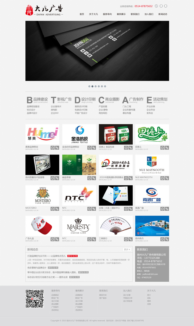 揚(yáng)州市大凡廣告?zhèn)髅接邢薰境闪⒂?009年,注冊(cè)資金100萬(wàn)元,是江蘇揚(yáng)州一家傳媒策劃公司,同時(shí)在南通市設(shè)有分公司,公司主要經(jīng)營(yíng)項(xiàng)目有:戶外廣告代理發(fā)布,企業(yè)品牌策劃、活動(dòng)策劃執(zhí)行、樣本畫冊(cè)印刷、宣傳片拍攝制作、各類廣告制作、廣告禮品定制。
